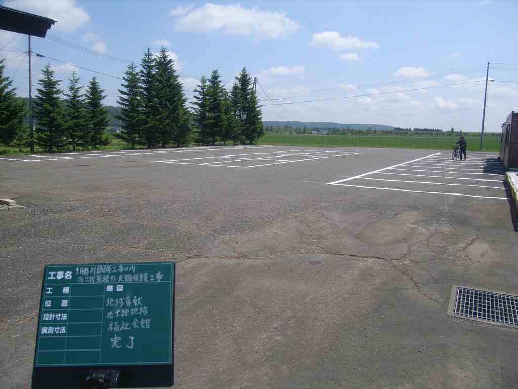 今回、芽室町西士狩神社周辺において地域貢献活動を行いました。弊社は、この地区で帯広開発建設部から「十勝川改修工事の内 西士狩築堤外天端保護工事」を受注しており、地区会長様に着工時のご挨拶に伺い、工事概要等を説明し、「地域でお困りのことがあればご相談下さい。」と申し添えたところ、「神社の周辺整備に困ってる。」とのお話を頂き、「弊社が出来ることであれば!」とひと肌脱がせていただきました。施工期間中は近隣住民にご理解ご協力をして頂き、無事に工事が完了できたことの恩返しとして、工事事務所に隣接していて、また、日頃地域の方々が管理使用している大森会館駐車場の舗装がひび割れや穴空きが酷いと言うことから、駐車場の舗装及び白線の修繕を地域貢献として行いました。同地区会長は「駐車場を綺麗にして貰い、大変嬉しい。」と喜びの声を頂きました。